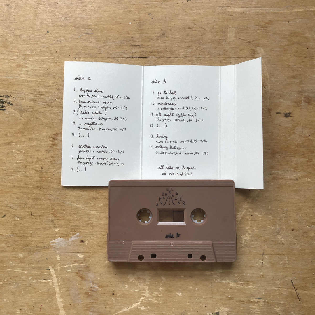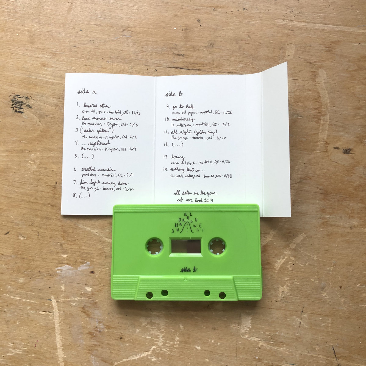 cassettes are hand-stamped by kenny and include a j-card designed by kenny and james lee chiahan, featuring kenny's mostly-legible cursive writing. note that the stamped tapes may have small cosmetic "flaws" due to the hand-made nature (matches the flawed recordings well, though!)